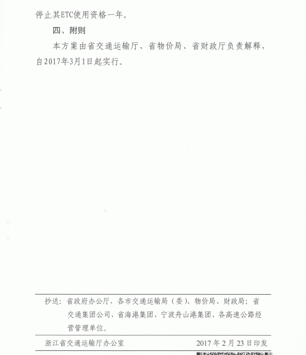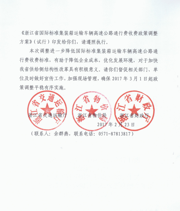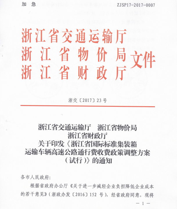 浙江省國際標準集裝箱運輸車輛高速公路通行費收費政策調(diào)整方案(試行) 浙交[2017]23號