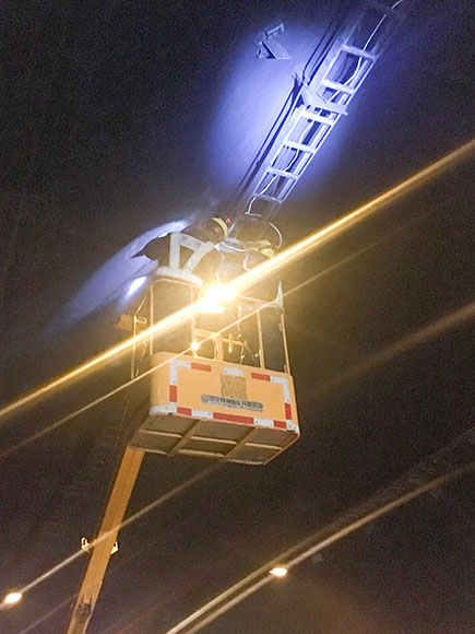 中午11:00,因流量過(guò)大,高速交警要求臨時(shí)開(kāi)放被堵主車道。趁此空隙機(jī)會(huì),中心隊(duì)伍暫撤到黃土嶺隧道管理所解決午餐,之后又馬不停蹄奔赴并集結(jié)在北洞口緊急停車帶,待重新封道后繼續(xù)跟進(jìn)作業(yè),力爭(zhēng)在審批時(shí)間內(nèi)做更多的維修??紤]到主車道燈具損壞不多,抽調(diào)一組登高車人員負(fù)責(zé)攝像頭檢修工作,而底下人員則負(fù)責(zé)修復(fù)更換消防、緊急電話等標(biāo)志燈,每組人員都在與時(shí)間賽跑,忙的顧不上喝水。