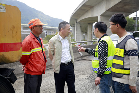 圖為集團副董事長、總經(jīng)理張建平在攻堅養(yǎng)護施工現(xiàn)場檢查