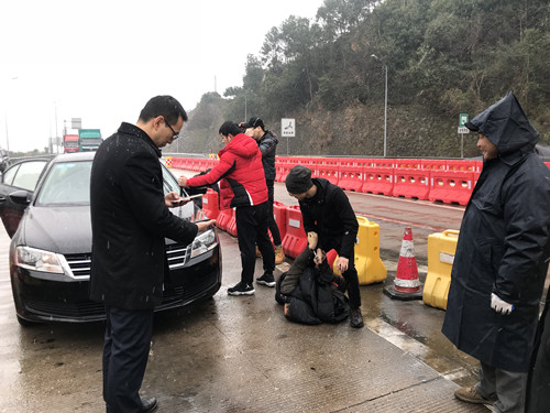 31日是春運(yùn)的前一天,下起了今年的第一場大雪。當(dāng)天10:30分左右,三號(hào)車道如往常一樣正常、有序,該車道正在檢查綠農(nóng)車。這時(shí)一輛牌照為浙JVIT6*黑色小轎車緩緩駛?cè)?,突然該車加速調(diào)整方向,想朝二號(hào)車道沖去。與此同時(shí)從它后方快速?zèng)_出一輛轎車檔在了該車前面,接著后方又沖出一輛黑色轎車,攔截在該車后方的去路。兩輛車上跳下幾個(gè)大漢,以迅雷不及掩耳之勢,一擁而上干脆利落的將車內(nèi)三名犯罪嫌疑人控制。 當(dāng)班收費(fèi)員被這一幕驚呆了,不過迅速反應(yīng)過來,啟動(dòng)應(yīng)急預(yù)案,呼叫監(jiān)控員,監(jiān)控員在監(jiān)控視頻中發(fā)現(xiàn)這個(gè)情況后,第一時(shí)間通知所長。所長孫明偉得知情況后立即趕赴現(xiàn)場,確認(rèn)核實(shí)身份,并令當(dāng)班班長第一時(shí)間聯(lián)系當(dāng)?shù)嘏沙鏊藢?shí)身份。在得到明確的答復(fù)后,工作人員立刻封閉該車道,為民警辦案提供方便,并打開備用車道正常收費(fèi)疏導(dǎo)過往車輛,組織人員疏散圍觀群眾避免車輛和人員停留過多影響民警辦案。