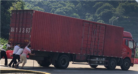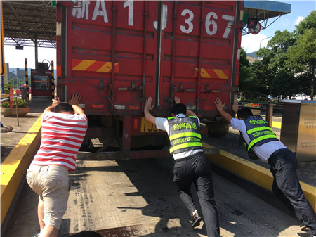 6月19日15時(shí)左右,一輛杭州牌照的大貨車,在進(jìn)入臨海南收費(fèi)所三車道時(shí)突然熄火拋錨,司機(jī)嘗試了幾次無(wú)法啟動(dòng),立刻下車檢查車況。 “師傅,怎么了?有什么能幫您?”收費(fèi)員徐海源見(jiàn)此情景,立即上前熱心詢問(wèn)。 “哎!包在油箱口的塑料紙?jiān)趺淳偷暨M(jìn)油箱內(nèi),現(xiàn)在車子怎么都發(fā)不動(dòng)不了。”司機(jī)有點(diǎn)發(fā)急地回答。 “師傅,別著急,我先找?guī)讉€(gè)同事幫您把車推出車道?!笔召M(fèi)員趕緊安慰司機(jī)焦急心情。 “好的,那謝謝你們。”司機(jī)連忙點(diǎn)著頭。為了避免車道堵車,徐海源立刻利用對(duì)講機(jī)向當(dāng)班班長(zhǎng)周萍說(shuō)明情況,周萍立刻關(guān)閉該車道,啟動(dòng)備用車道。此時(shí)此刻,收費(fèi)員李俊杰、楊旭佳毫不猶豫的趕了過(guò)來(lái)與駕駛員一起推動(dòng)車子。“一、二、三,一、二、三,使勁呀……”可是車子仍然紋絲不動(dòng)。怎么辦?請(qǐng)求支援!正準(zhǔn)備下班的行政人員陳瑩、劉華萍得知情況后,二話不說(shuō)飛奔到車道,加入到推車行列中。用力推呀——哎,不行;再來(lái)一次——還不行。面對(duì)23.97噸的大貨車,大家仍是束手無(wú)策?!叭フ腋F棒試試!有道是給你一根鐵棒,我能翹起整個(gè)地球。”不知是誰(shuí)大喊了一聲?!靶?,可以試試,快去找”話音剛落李俊杰快步跑向所內(nèi),尋找鐵棒。不一會(huì)兒,只見(jiàn)他興奮地高舉鐵棒沖著大家喊道:“找到了!找到了!”