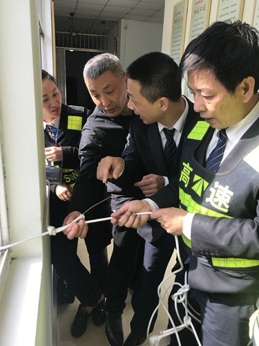 “隨著生活條件的改善,在高層建筑辦公、居住的人越來越多,如果遇見高層建筑火災,我們該如何自救?” “逃生時千萬不要乘坐電梯。” “彎腰、捂住口鼻,先采取往下層疏散逃生,實在不行時再考慮往上層逃生。” “一般高層的樓道上,應該會配有逃生繩吧!如果備有逃生繩,可以根據(jù)現(xiàn)場情況使用。” “逃生繩雖然在火災中作用很大,但事實上很多人卻不會使用,在緊急情況下很少能派得上用場。” “大家都知道逃生繩是一種可以在火災中用于自救、救人或者轉移財物時使用的繩索工具,廣泛用于高層建筑,實用性比較強。但可惜的是,絕大多數(shù)的人都不會使用繩結,那么今天我們針對這一現(xiàn)狀,著重訓練逃生繩的安裝使用。”
