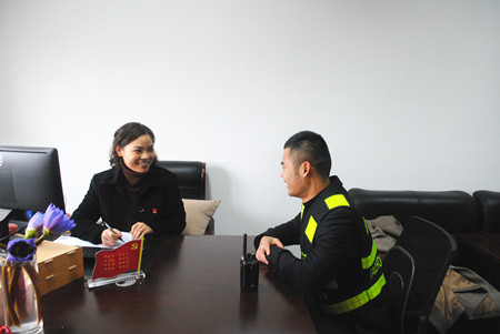 圖為臺(tái)州收費(fèi)所所長助理牟妲與二班班長馬德偵談心