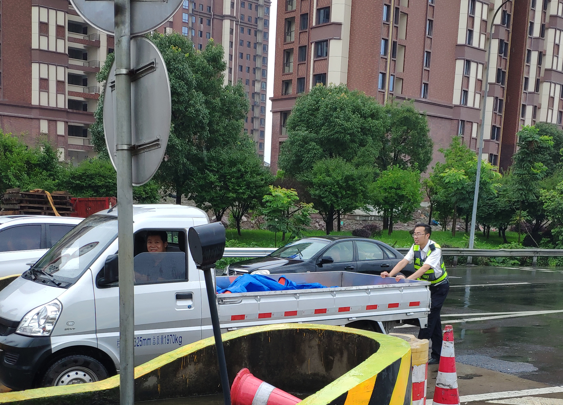 車(chē)輛故障拋錨 收費(fèi)員冒雨推行 7月4日中午12時(shí)30分左右,一輛牌照為浙開(kāi)頭的五菱小貨車(chē)停在臺(tái)州收費(fèi)所出口5號(hào)車(chē)道安全島邊上許久未動(dòng),來(lái)往車(chē)輛紛紛避開(kāi)該車(chē)道。當(dāng)班班長(zhǎng)郭斯泓發(fā)現(xiàn)這一情況后立即上前詢問(wèn),并在該車(chē)后放置隔離桶,提醒駕駛員打開(kāi)雙閃燈。