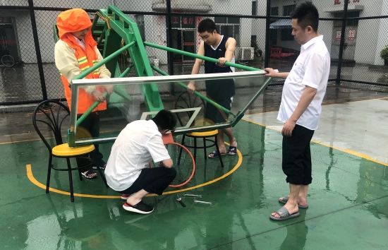 圖為所負責人帶領人員拆卸籃球架 此前,溫嶺西已經(jīng)做好基礎的抗臺防范工作,關(guān)閉所內(nèi)各寢室、辦公室門窗,提前裝好沙袋備用,準備好抗臺物資及近幾天的餐食,確保所內(nèi)各項事務正常運行。8月9日上午,該所長、副所長在臺風前做最后一次細致的排查,三人還親自動手將陽光房的窗戶都卸下來,避免風力太大,玻璃破裂,造成安全隱患。此外,為預防操場籃球架承受不住巨大風力,將籃球框拆卸下來,把籃球架放倒。其后通知所內(nèi)開車的人員將所有車輛停入操場中,以防止周邊樹木被風刮斷,造成車輛損失。 林夢灑