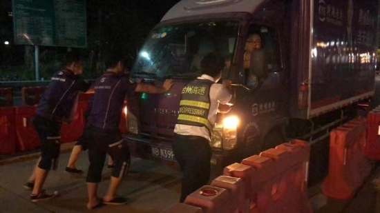 圖為收費(fèi)員幫助司機(jī)將故障車輛推出車道 8月15日凌晨1點(diǎn)多,溫嶺西收費(fèi)所征費(fèi)二班安全員在日常巡邏時(shí)發(fā)現(xiàn)一輛小型貨車停在進(jìn)口內(nèi)廣場(chǎng),在詢問司機(jī)后得知車輛因出現(xiàn)故障導(dǎo)致無(wú)法發(fā)動(dòng)。安全員當(dāng)即叫來(lái)旁站人員,與兩個(gè)司乘人員一起用力,慢慢地將該車推出車道。在婉拒了司機(jī)遞香煙的好意后,安全員囑咐司機(jī)盡快聯(lián)系人員前來(lái)解決,后回到崗位繼續(xù)工作。