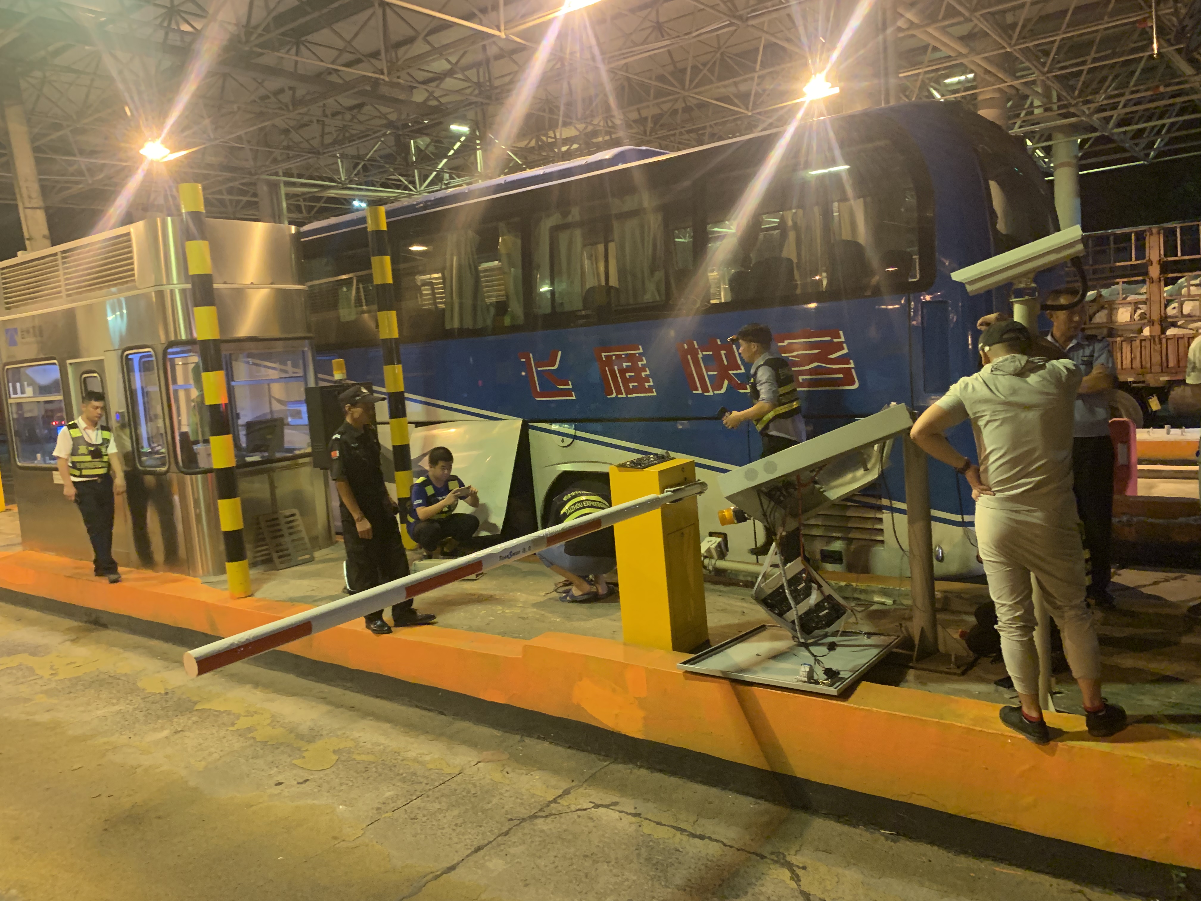 圖為事故處置現(xiàn)場 當晚,收費員蔣弓在進口車道突然聽到一聲巨響,發(fā)現(xiàn)一輛客車裝行李的側門撞到ETC設備,且損壞情況非常嚴重。因為大客車堵塞車道,后面的司機不明情況排起了車隊。班長李寧一邊協(xié)同派出所執(zhí)勤點工作人員維持秩序,一邊向監(jiān)控中心匯報現(xiàn)場情況。監(jiān)控中心也馬上聯(lián)系了路產、維養(yǎng)中心、高速交警多個部門。在20分鐘內所有部門陸陸續(xù)續(xù)趕到現(xiàn)場。為盡快恢復交通,維養(yǎng)中心同事馬上對損壞ETC設備進行拆卸檢測,路產部門對損壞設備進行定損估價,高速交警勘查現(xiàn)場,拍照取證判定事故責任,溫嶺西收費所工作人員維持進口秩序,大家都在高效有序地處理突發(fā)事件。