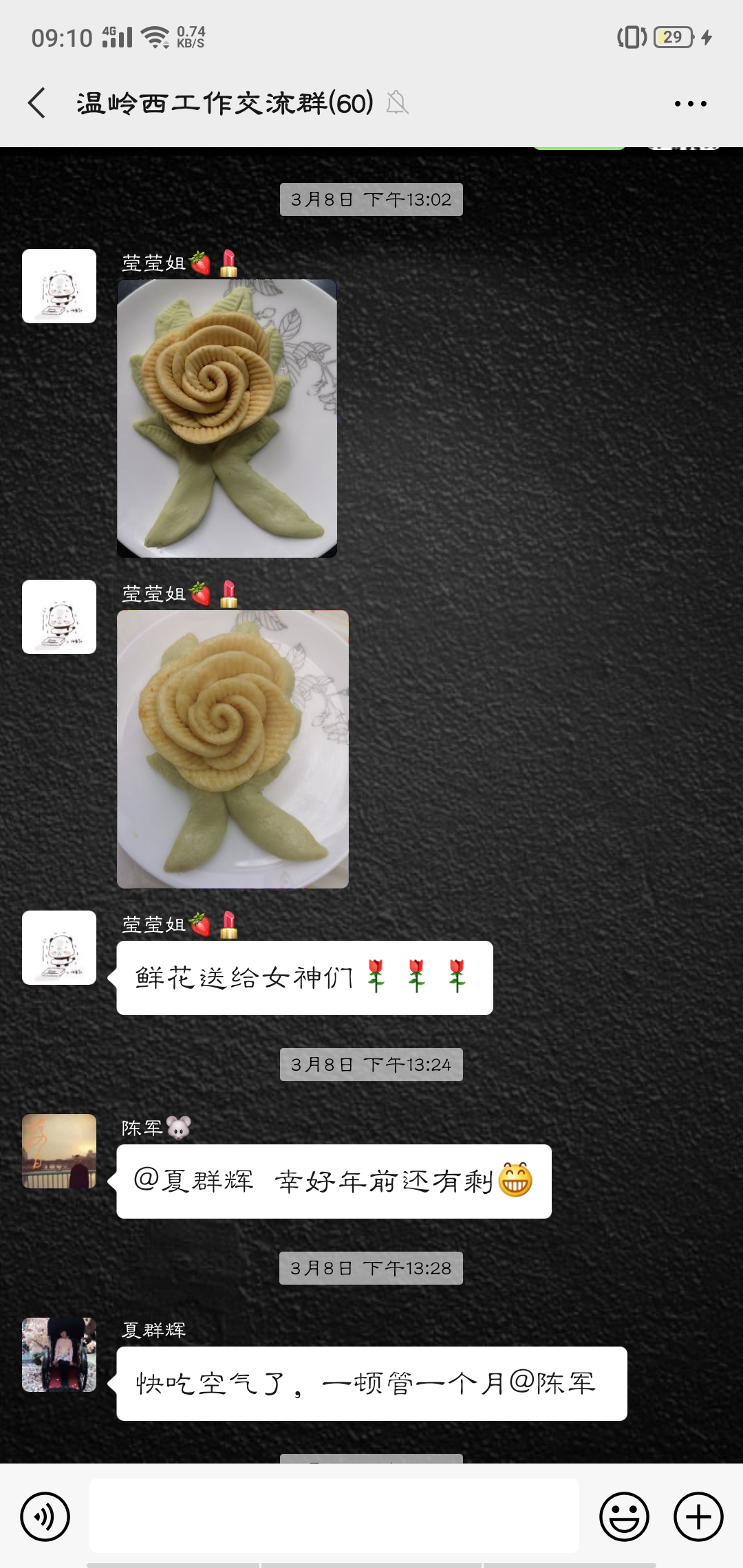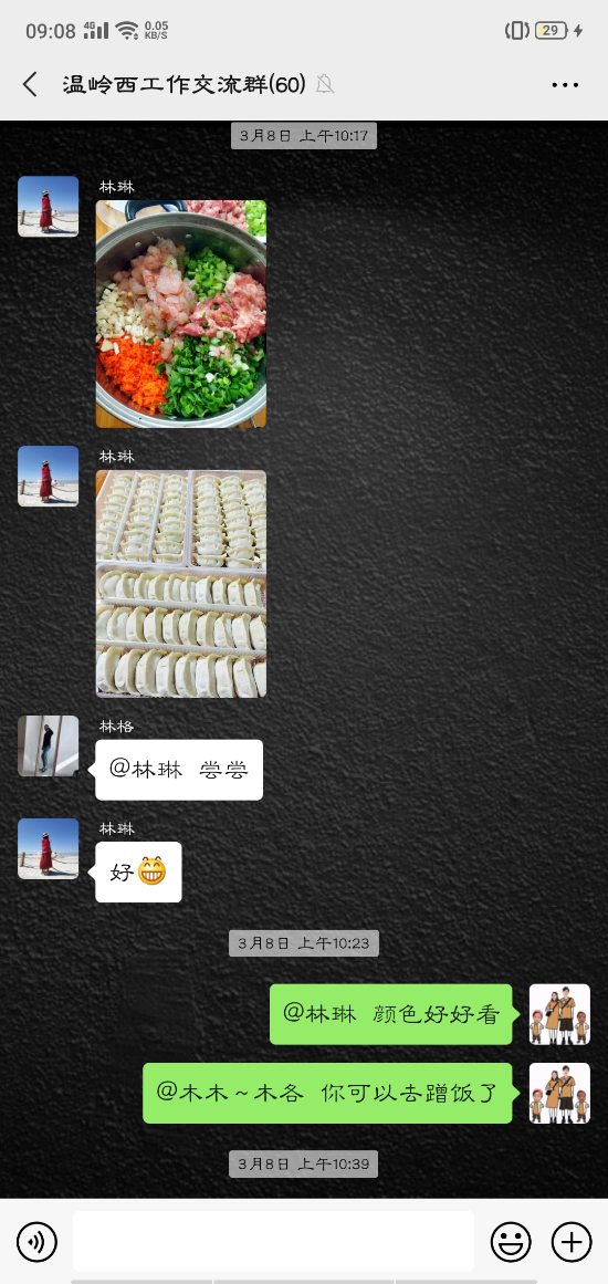 活動(dòng)中,大家的參與性都很高,紛紛在微信群內(nèi)曬出自己制作的美食:鹽焗雞、可樂(lè)雞翅、蔥油角角魚、溫嶺小吃豬肉飯、玫瑰南瓜饅頭……紛紛亮出了自己的拿手好菜,在群里談?wù)摰脽峄鸪斓耐瑫r(shí),也不忘介紹一下自己做的菜。甚至很多男同事也紛紛曬出自己的最佳廚藝,祝福女同胞節(jié)日快樂(lè)。