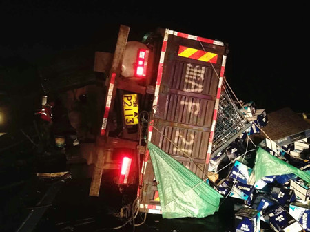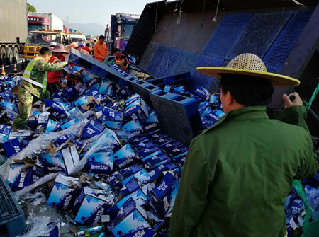 8月25日凌晨4點,甬臺溫高速溫向1648+7路段,一輛運啤酒的大貨車因司機疲勞駕駛,導(dǎo)致車輛撞上中央護欄而側(cè)翻,啤酒灑滿一地,后方兩輛貨車避讓不及造成多車事故。