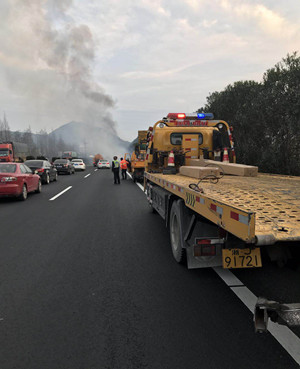 事態(tài)緊急,刻不容緩,清障車立即拉響警報(bào)預(yù)警,迅速提速超過(guò)事故車,指引該車轉(zhuǎn)入應(yīng)急車道避免二次事故。由于該車運(yùn)載易燃品,天氣晴好,火勢(shì)借東風(fēng)迅速變猛,無(wú)法直接現(xiàn)場(chǎng)救援,事故車駕駛員已經(jīng)手忙腳亂。施救中心工作人員立即緊急上報(bào)指揮中心請(qǐng)求消防車支援。中心“2+1+n” 快速應(yīng)急模式隨即馬上啟動(dòng),17:30分在中心待命的施救車也到達(dá)現(xiàn)場(chǎng)配合預(yù)警,保持事故現(xiàn)場(chǎng)另一車道暢通,不影響其他車輛安全通行。 17:40分消防車到達(dá)現(xiàn)場(chǎng)滅火,18:15火滅,清障車帶事故車離開現(xiàn)場(chǎng)。從發(fā)現(xiàn)到處置完畢僅1小時(shí),無(wú)人員傷亡,高速公路也一直保持安全暢通。 童軍偉