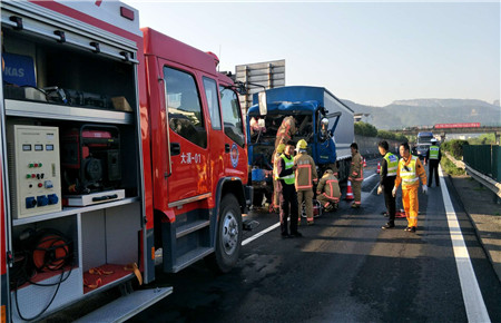 4月19日上午6點(diǎn)10分,寧向大溪出口正在進(jìn)行分流,所有車輛正緩慢前行中,一輛贛F38***牌照的藍(lán)色大貨車顯然還沒(méi)有適應(yīng)這分流的節(jié)奏,“砰”地一聲猛然撞上了前面的大貨車。 兩個(gè)“大家伙”碰撞的威力非同小可,直接的后果就是后車的車頭變形,損傷極大,貨車駕駛員被卡在車頭里出不來(lái)。 時(shí)間就是生命,施救中心迅速出動(dòng),配合交警、消防部門(mén)在現(xiàn)場(chǎng)進(jìn)行預(yù)警,并協(xié)助進(jìn)行事故處理。