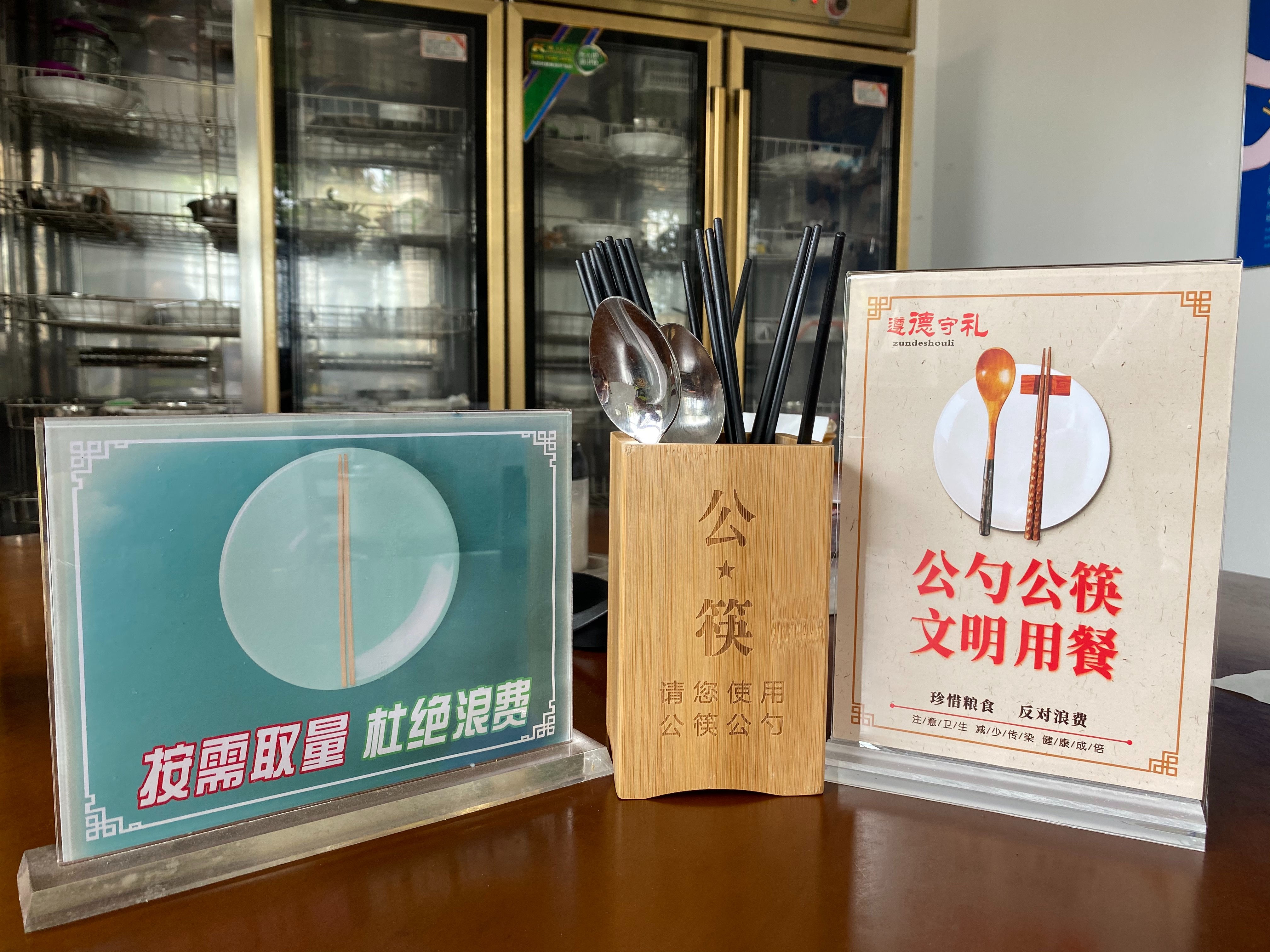 該所通過食堂粘貼宣傳畫、餐桌放置宣傳標(biāo)牌、設(shè)置公用筷子筒等多種方式進行廣泛宣傳,以此提升“反對浪費、公筷公勺、文明健康”的活動知曉率,促進全體員工積極參與,引導(dǎo)員工自覺杜絕“舌尖上的浪費”。