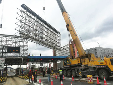 據(jù)悉,臺州收費站頂棚鋼結(jié)構(gòu)廣告總重106噸,總面積達850平方米,頂棚下車流密集,給拆卸作業(yè)帶來了嚴峻的考驗。“這項工程涉及高空作業(yè),站頂棚風大又冷,稍有不慎就有可能危及施工人員和過往司乘的安全,我們得時刻關注過站車流量,還有易燃易爆危險車,視車流情況開放施工出口匝道,斷斷續(xù)續(xù)切割廣告牌,避開車流高峰,確保高速主線行車安全?!睏罱鹆阂豢滩浑x地駐守在施工現(xiàn)場。安全責任大于天大,就連當天他的父親動手術他都沒能陪伴身邊。