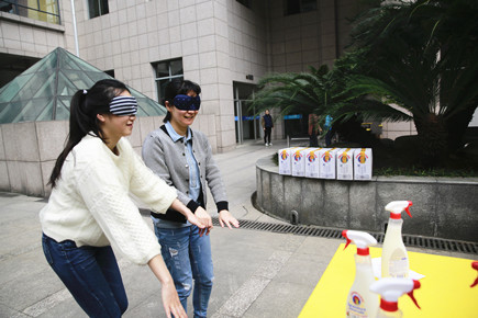 圖為職工在參加蒙眼取物項(xiàng)目