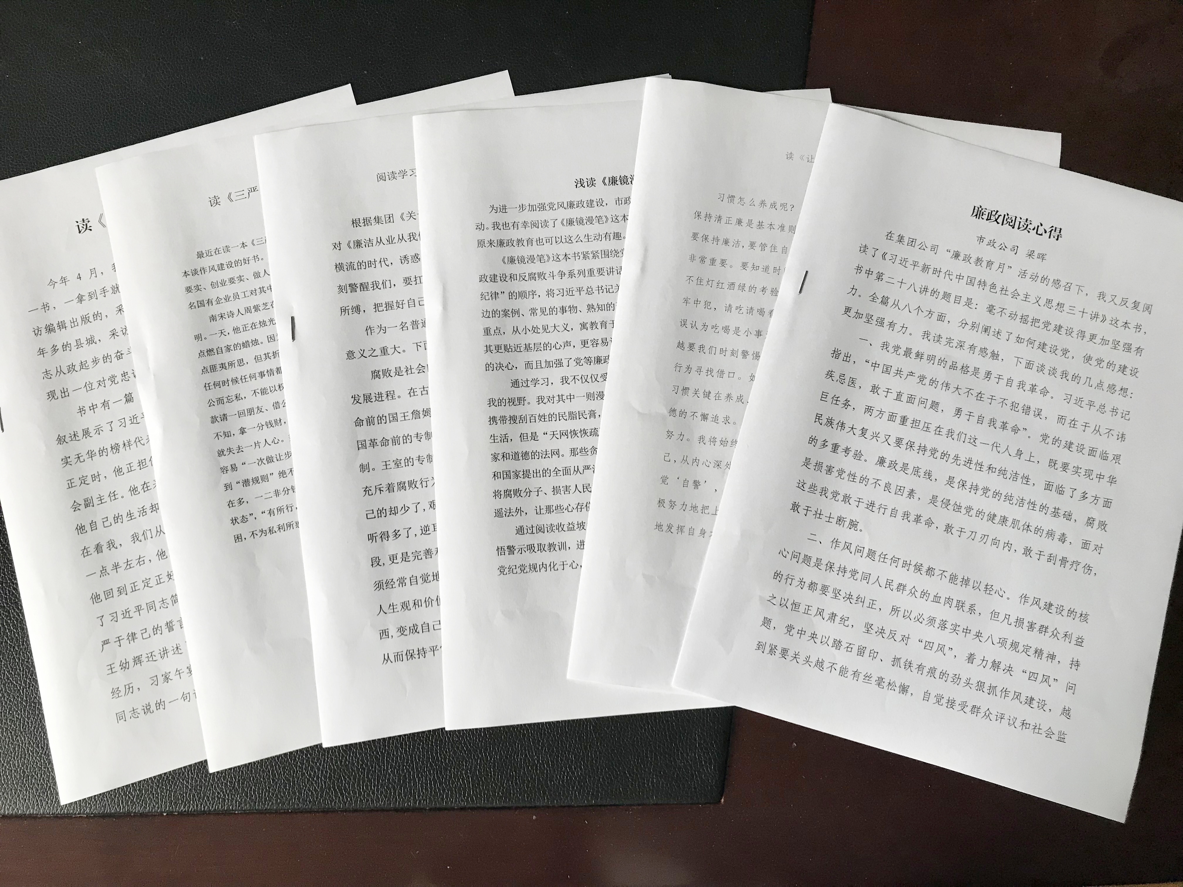 圖為集中學(xué)習(xí)現(xiàn)場 每月月度例會上,市政公司組織員工有針對性地學(xué)習(xí)集團(tuán)和市政公司的制度與流程。該公司制作了一本制度匯編,并分發(fā)到人手一本,要求員工認(rèn)真學(xué)習(xí),熟悉公司辦事流程和規(guī)章,工作中做到照章辦事,增強(qiáng)員工的制度觀念。 5月月初,市政公司組織開展讀書思廉活動,要求每位員工讀一本勤政廉政書籍,并撰寫一篇讀書心得。從一篇篇心得體會文章中,看到有從歷史廉政小故事切入的,也有從習(xí)近平總書記的新時代中國特色社會主義思想和十九大報告中領(lǐng)悟道理的,字字流露了真情實(shí)感,句句體現(xiàn)出真切感悟,真正做到了學(xué)有所悟,營造了良好的學(xué)廉思廉的氛圍。